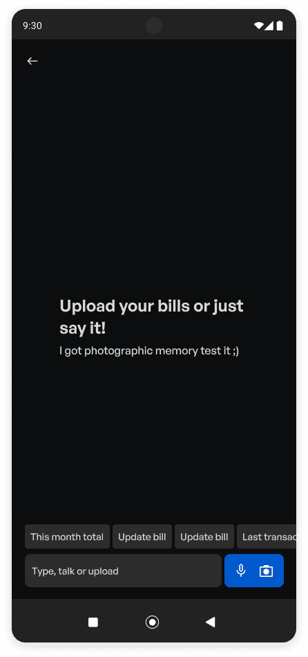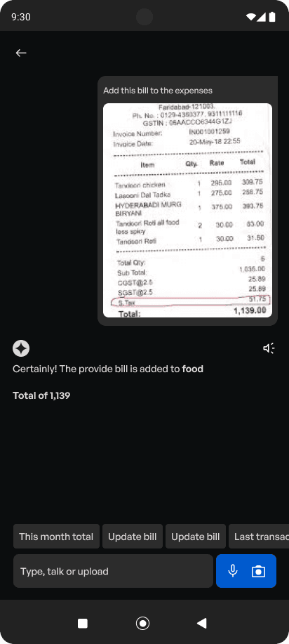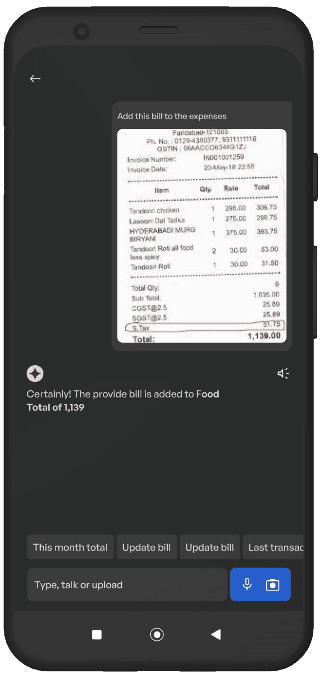 Users can scan or upload physical receipts or bills, and the AI automatically extracts relevant information and logs the expense.