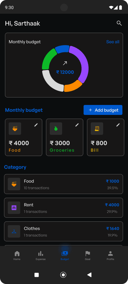 In this section user can add their monthly budget with categories which helps to reduce the excess spending on any category.